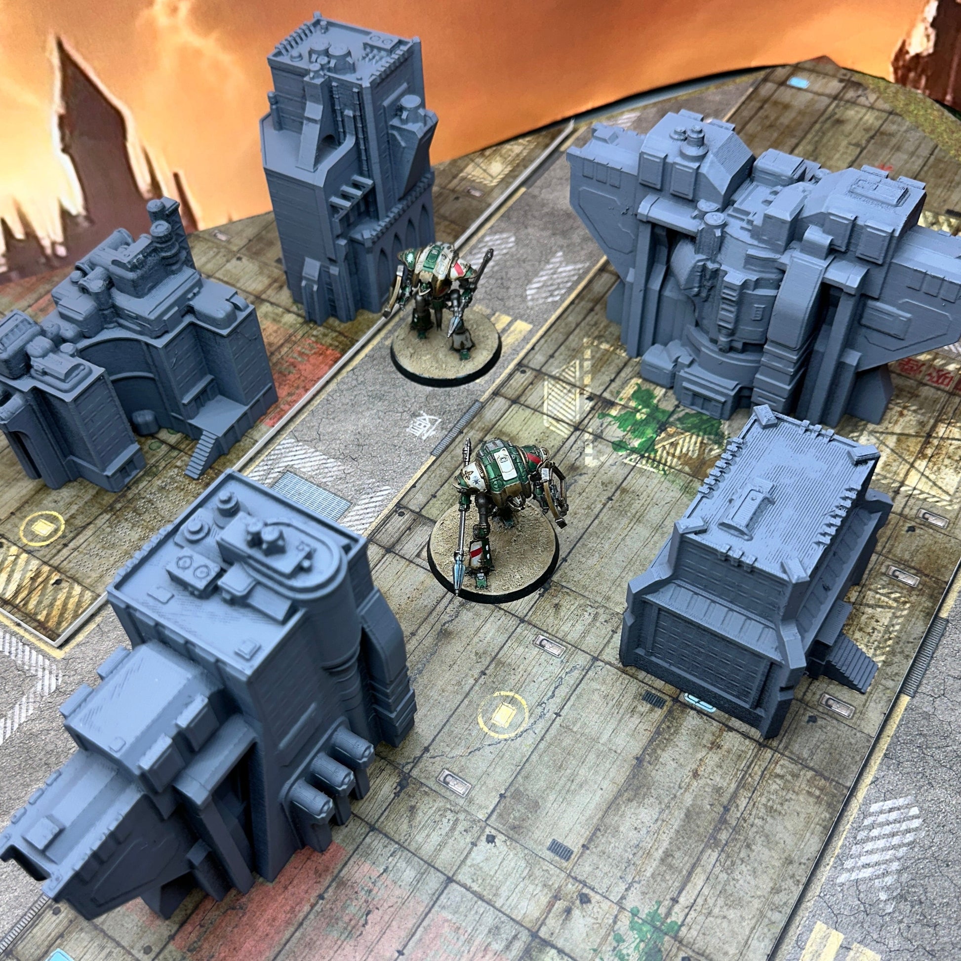 Boost your wargaming adventures with our City block Terrain Set! This futuristic collection features intricately designed buildings and landing pads, perfect for Battletech or sci-fi battles, adding strategic depth and immersive detail to your tabletop.